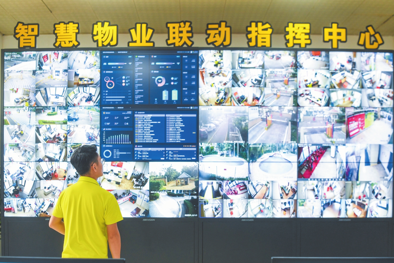 日前,在四季華庭小區(qū),工作人員借助智慧物業(yè)聯動指揮中心的監(jiān)控大屏查看小區(qū)情況。