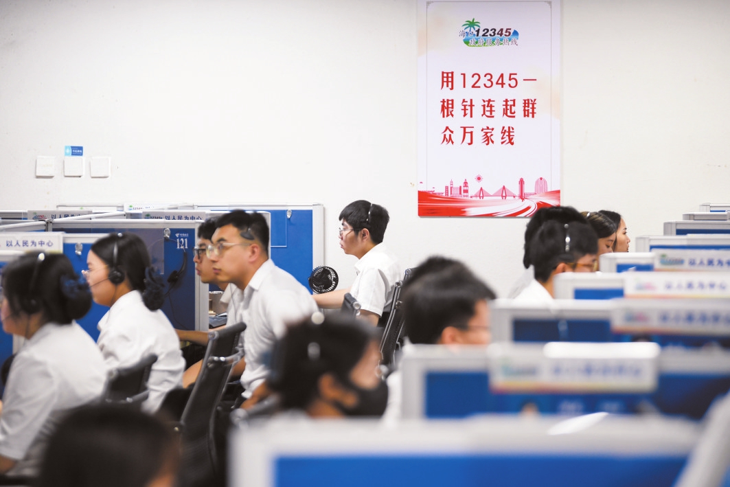 5月24日,在12345海口市民服務智慧聯動平臺話務間,工作人員正在接聽群眾熱線。