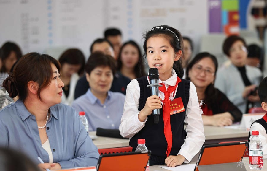 蓬萊路第二小學(xué)的孩子在向黃浦區(qū)婦聯(lián)、老西門街道負(fù)責(zé)人提出自己對兒童友好空間打造的建議。 蔡維帥 攝