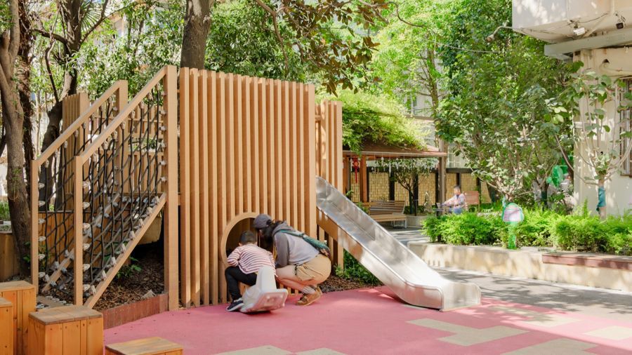最終,設(shè)計師圍著一棵廣玉蘭和一棵小桂花樹打造了“兒童游戲區(qū)”,設(shè)計了小小的樹屋滑梯,提供爬網(wǎng)與木樁小山的雙重攀爬選擇。木樁小山背后設(shè)計了一個超大的黑板墻?!耙庀氩坏降摹糜谩?。居委干部告訴我們,孩子們在黑板上不只是涂涂畫畫,還能寫作業(yè)、算數(shù)學(xué)題?!?/p>