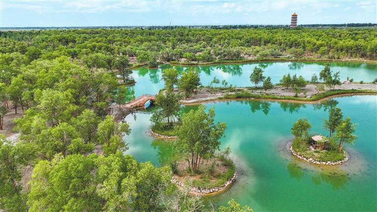 近日,在金塔沙漠胡楊林,清澈的湖水、蔚藍(lán)的天空與綠意盎然的胡楊林,共同繪成一幅夏日圖景。通訊員 曹紅祖