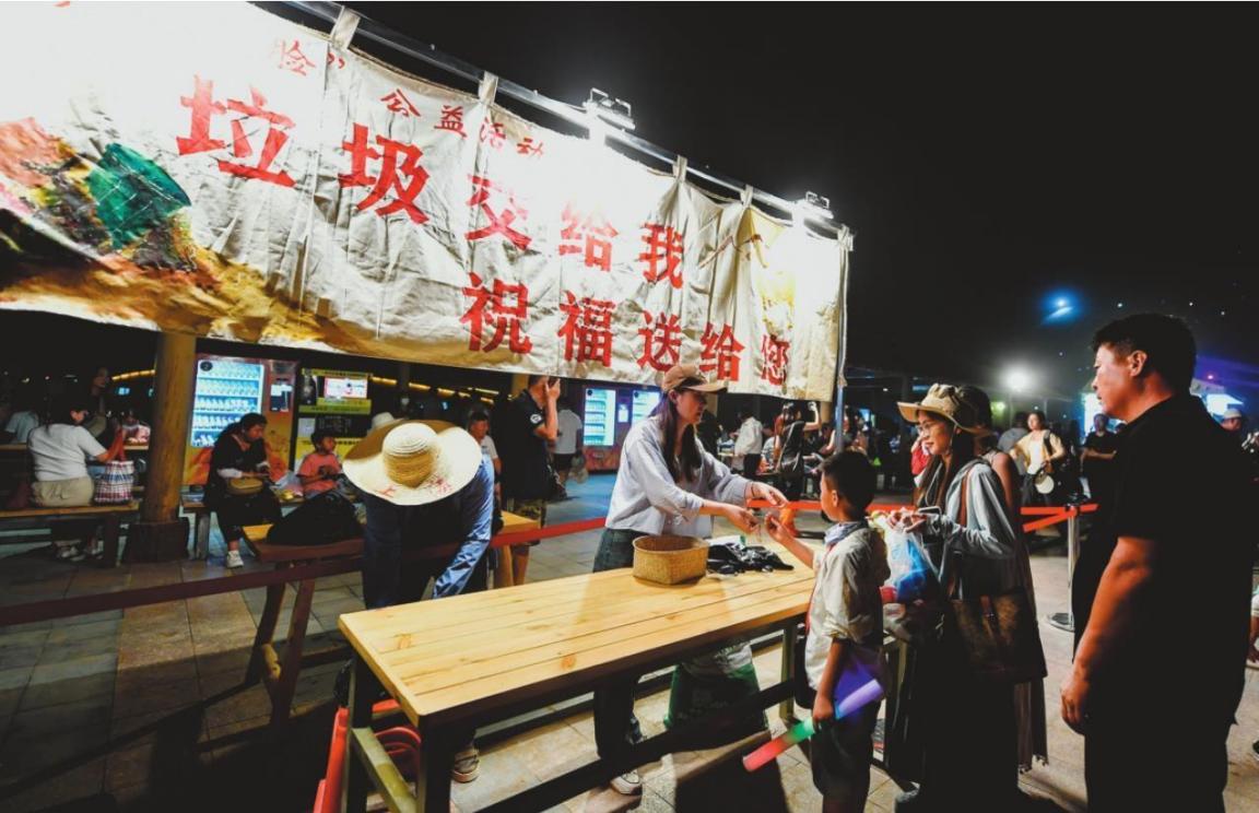 7月20日晚,在敦煌鳴沙山月牙泉景區(qū)的沙漠萬(wàn)人星空演唱會(huì)現(xiàn)場(chǎng),游客拎著垃圾向景區(qū)工作人員兌換小禮品。今年暑期,隨著沙漠萬(wàn)人星空演唱會(huì)火爆出圈,甘肅省敦煌市鳴沙山月牙泉景區(qū)日均接待游客達(dá)2萬(wàn)人次。景區(qū)推出的“沙山洗臉”公益活動(dòng),通過(guò)撿垃圾兌換小禮品等方式,引導(dǎo)游客在享受沙漠萬(wàn)人星空演唱會(huì)浪漫的同時(shí),共同守護(hù)鳴沙山的生態(tài)環(huán)境。