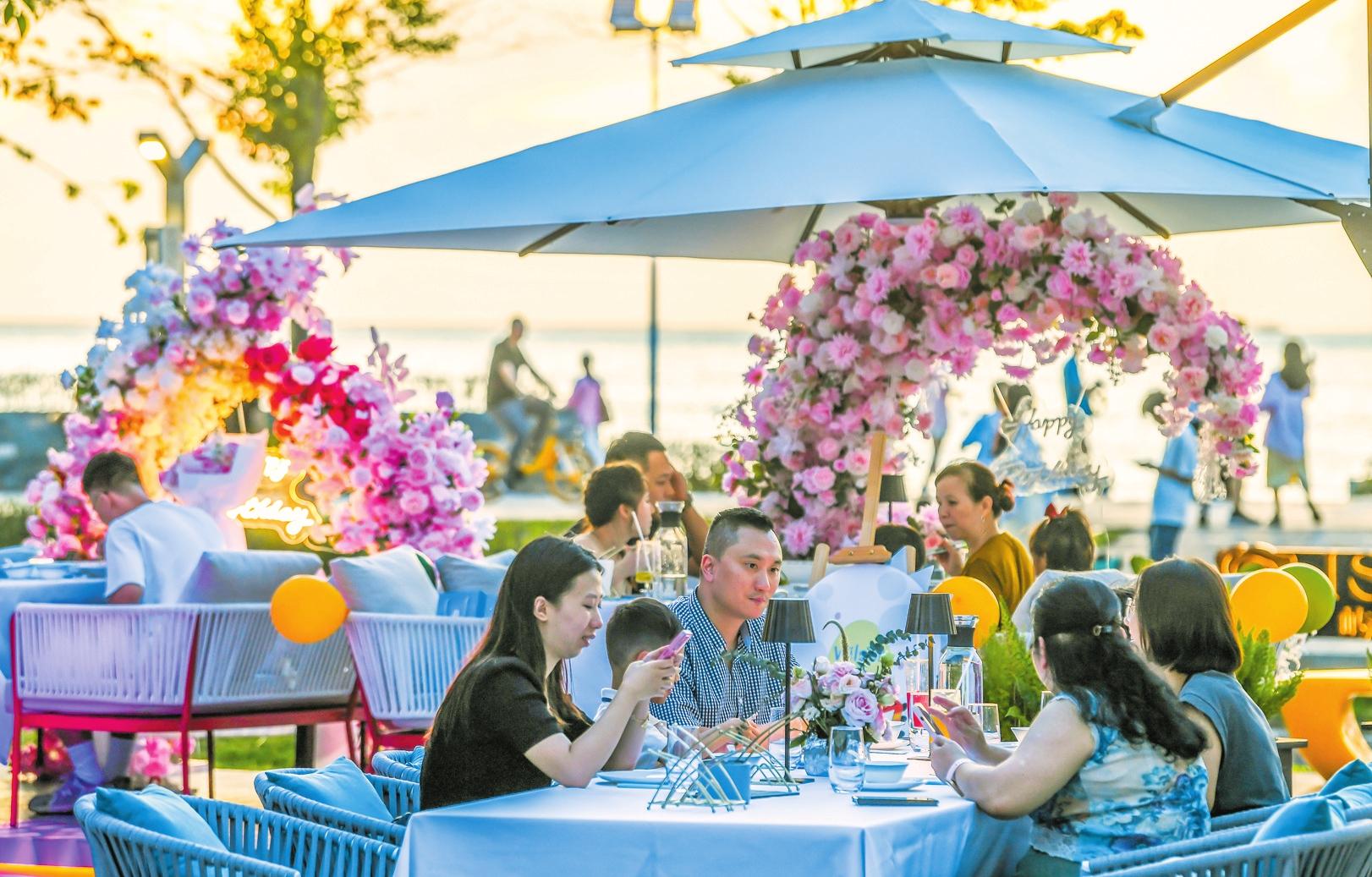 近日,走進(jìn)位于龍華區(qū)的海口FUNBAY自在灣商業(yè)街區(qū),記者看到已有不少品牌入駐。據(jù)介紹,該街區(qū)計(jì)劃于年內(nèi)正式開(kāi)街,規(guī)劃有包括餐飲、娛樂(lè)、復(fù)合零售等在內(nèi)的多個(gè)業(yè)態(tài)。在IS PARTY嶼海之約餐廳酒吧,露天區(qū)域被鮮艷的花束裝點(diǎn)得十分浪漫,食客們?cè)谄渲袃A聽(tīng)音樂(lè)、享用美食?!拔覀兛粗泻?跒车膮^(qū)位優(yōu)勢(shì),希望通過(guò)提供濱海消費(fèi)場(chǎng)景,為??谠鎏砘盍Ω泻蜁r(shí)尚感。”該餐廳酒吧店長(zhǎng)王李平介紹。