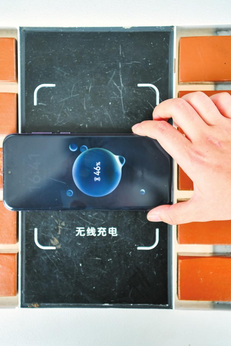 市民在智能公交站臺,使用座椅旁的無線充電器為手機(jī)充電。記者 孫士杰 攝