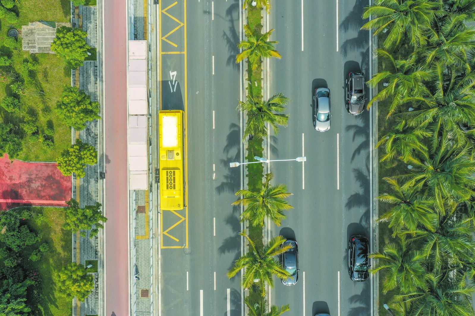 白駒大道沿線,造型獨特的公交站臺與路邊一字排開的椰樹相映成趣,彰顯??诘摹拔兜馈?。記者 孫士杰 攝