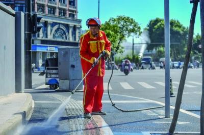 8月4日凌晨4:00,天剛亮,環(huán)衛(wèi)工王巧榮已準(zhǔn)時出現(xiàn)在玄武區(qū)月苑西路上工作,此時雖是一天中氣溫較低的時候,可不一會兒,她整個人就像從水里剛撈上來一般。為搶在太陽完全出來前完成第一遍大清掃,她顧不上片刻休息,只是不時用掛在脖子上的毛巾擦拭臉上和脖子里的汗水,“這些天,氣溫高,每天出門清掃時間比以往提前了1小時左右?!蓖跚蓸s告訴記者,大約上午6時前她就完成了第一遍大清掃,之后的工作以撿拾路面漂浮物為主,上午10時就收工回家,下午工作時間則是3時—5時,晚上6:30以后再開啟“晚保潔”模式,“雖然天氣很熱,但各項保障非常到位,最高溫時間段基本不出門,工作中累了渴了就去附近的安康驛站吹吹空調(diào)、吃點西瓜?!蓖跚蓸s說,干了15年的環(huán)衛(wèi)工作,她早已習(xí)慣了高溫、嚴(yán)寒等各種考驗。