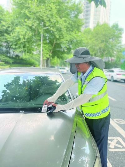 7月31日,南京最高氣溫又輕松越過了38℃,下午3時后,盡管氣溫開始掉頭向下,但馬路上還是熱浪翻滾,三牌樓大街停車收費員曹文磊仍如平時一樣耐心地指揮著每一位停車人,“方向盤向右打死,掛倒擋,走……”曹文磊手、嘴并用,烈日下的他滿臉通紅、大汗淋漓。當(dāng)車輛按方向停進泊位內(nèi)后,他隨即拿出打單機、車輛信息系統(tǒng)錄入機進行停車收費的相關(guān)操作,邊操作邊眼看四方,“那邊又有一輛車來了。”他迅速趕過去進行打單、拍照等一系列同樣操作。