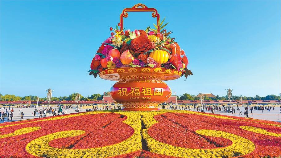 9月23日,天安門廣場“祝福祖國”巨型花籃已吊裝完成,廣場裝扮一新,東西兩側(cè)花壇里海棠花、菊花、串紅等花卉競相開放,花團(tuán)錦簇盛裝迎接國慶75周年。特約攝影 朱昱銘
