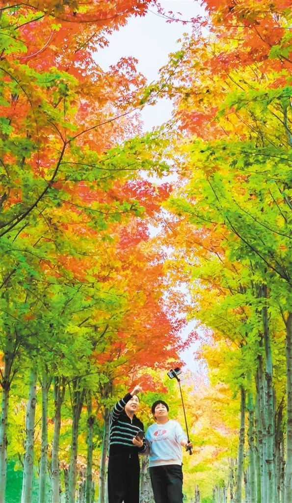 10月8日,河南省洛陽市宜陽縣蓮莊鎮(zhèn)孫留村,游客在濱河公園楓葉林拍照。田義偉攝(中經(jīng)視覺)