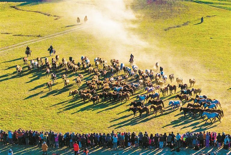9月25日,內(nèi)蒙古自治區(qū)赤峰市克什克騰旗烏蘭布統(tǒng)景區(qū),壯觀的萬馬奔騰表演,吸引了大批游客和攝影愛好者。張連華攝(中經(jīng)視覺)