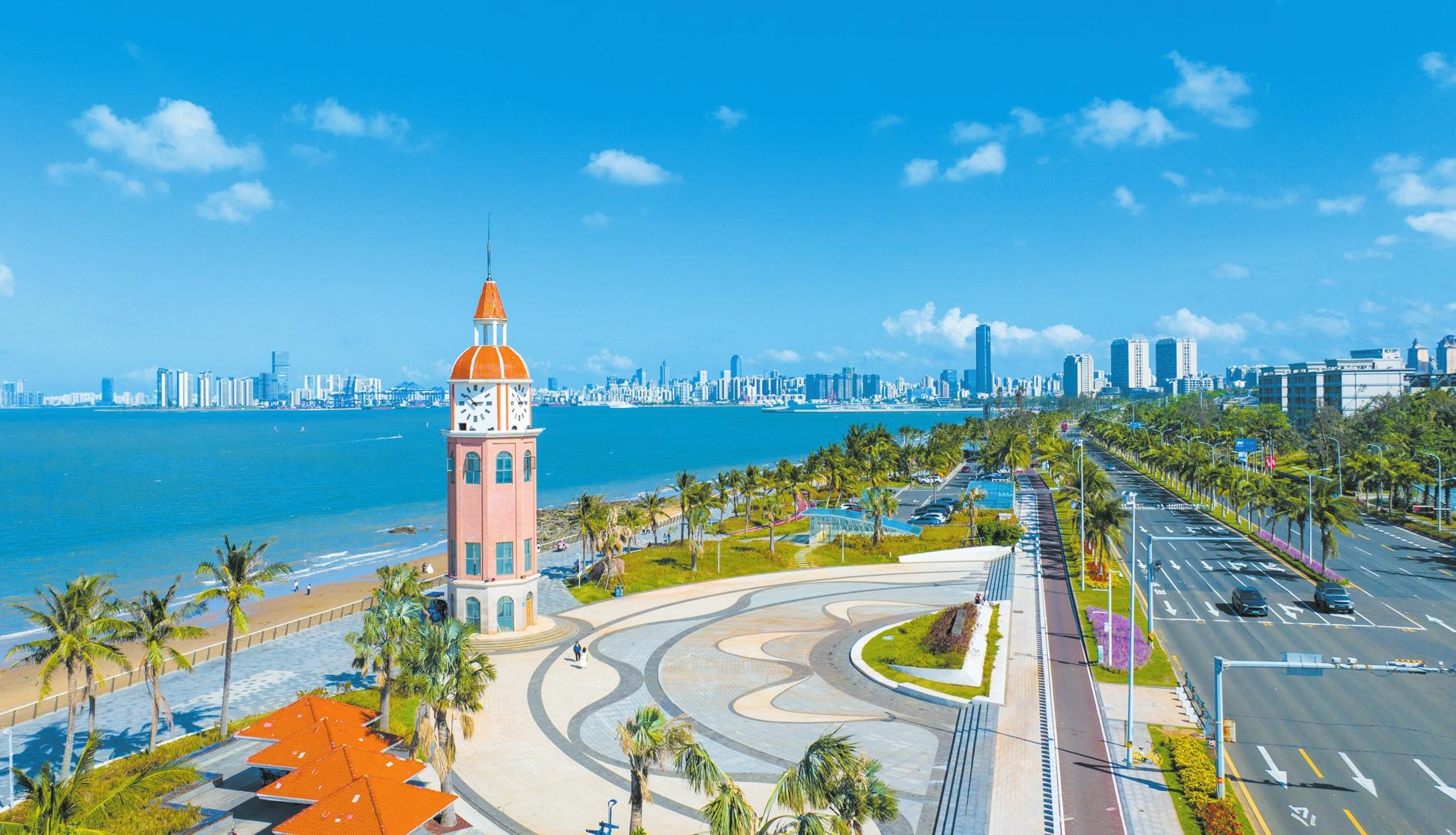 圖為10月20日,遠(yuǎn)眺濱海大道,水天相接,岸邊的沙灘、鐘樓、椰林融為一體,相映成趣,椰城??诘臑I海美景一覽無(wú)遺。記者 楊忠凱 攝