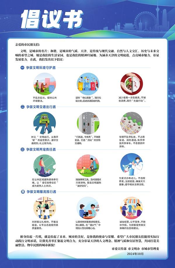 “俯身撿起一片紙,就是撿起了未來。城市的美好,是你我的使命與榮耀。”天津市委宣傳部、市文明辦、市城市管理委10月29日向全市發(fā)出倡議,號(hào)召人人爭做文明環(huán)境守護(hù)者、文明交通出行者、文明養(yǎng)寵責(zé)任者、文明服務(wù)踐行者,以自身的文明行為充分彰顯天津的人文理念、精神氣質(zhì)和宜居智慧,共同打造美麗整潔、物阜民熙的城市新貌。