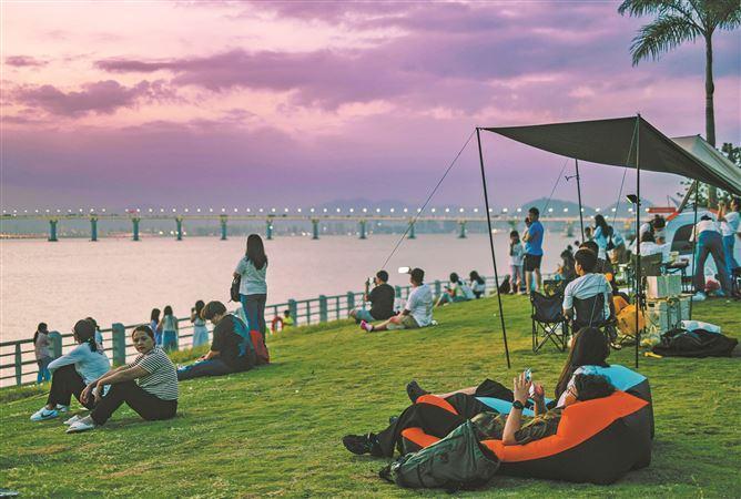 落日余暉千百態(tài),瀏江古渡荻花洲。傍晚海風習習的海灘上,露營的家庭、玩沙的孩童、拍夕陽的情侶,都為愜意的海灣悠閑添上了幾分松弛感。