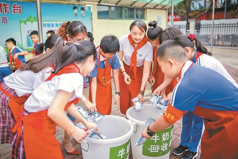 在垃圾分類的可回收物中,校園奶盒回收價(jià)值低,深圳進(jìn)一步探索建立低值可回收物回收鏈路。2021年9月,深圳市將垃圾分類與校園實(shí)踐教育相結(jié)合,發(fā)起校園奶盒資源回收行動(dòng)。