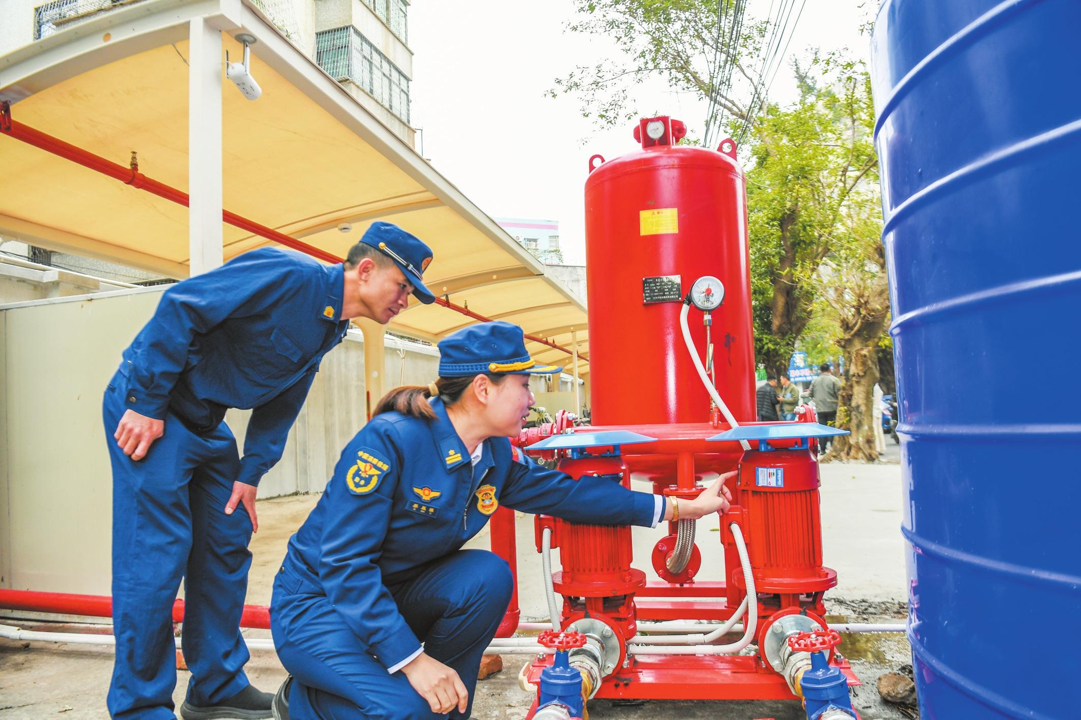 在??谑旋埲A區(qū)秀英村社區(qū),消防人員正在檢查新建電動自行車棚的自動滅火裝置。記者 康登淋 攝