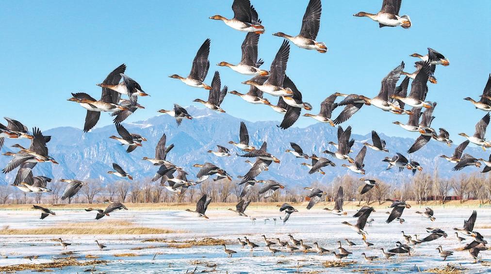近日,延慶野鴨湖濕地自然保護(hù)區(qū)內(nèi),成群結(jié)隊的大雁從遠(yuǎn)方歸來,在冬雪殘冰與藍(lán)天碧水交織的奇幻世界中翱翔、嬉戲,為這片靜謐的濕地帶來一抹初春的靈動與生機(jī)。馬文曉 攝