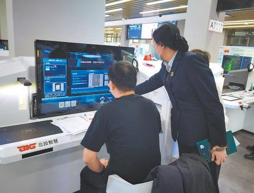 這座大廳開放運行后,北京東部地區(qū)的群眾辦理市級事項,不必再橫穿城市趕往六里橋政務(wù)服務(wù)中心了。辦事人在大廳入口取號后,會得到一個印有二維碼的紙條。憑身份證或二維碼,可以打開智能自助終端。智能終端類似一臺裝著屏幕的電腦桌,桌面上除了鍵盤、USB插口、耳機插口,還有呼叫人工服務(wù)的按鈕、無線充電圈……可以辦理市區(qū)兩級3000余項業(yè)務(wù)。