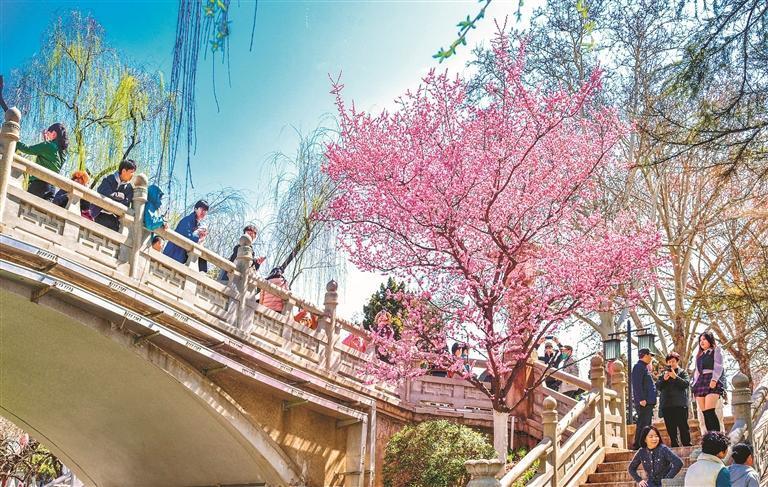 城墻下,紅葉李滿樹(shù)繁花,小巧而密集的粉白色花瓣簇?fù)碇埸S的花蕊,吸引了大量游人前來(lái)觀賞,感受歷史韻味與春日風(fēng)情的交融。候鳥(niǎo)歸來(lái),或在護(hù)城河水面嬉戲,或忙著銜枝筑巢。
