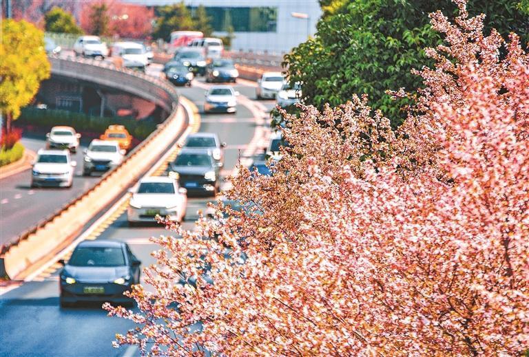 南二環(huán)沿線,嬌艷的紅梅率先點(diǎn)亮了春天的色彩。玫紅色的花瓣在陽(yáng)光的照耀下鮮艷奪目,與周邊嫩綠初現(xiàn)的綠植相互映襯,形成了一幅生機(jī)勃勃的畫(huà)面。