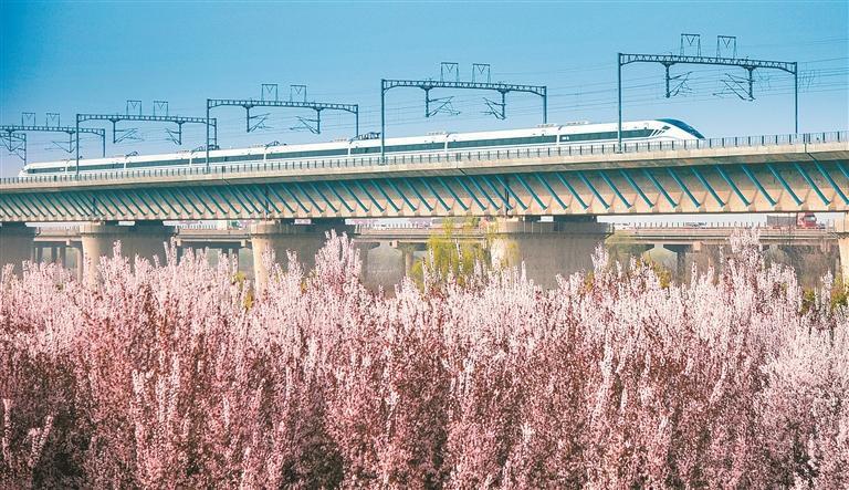 一列高鐵列車駛過(guò)渭河大橋,在紅葉李花映襯下宛如“開(kāi)往春天的列車”。