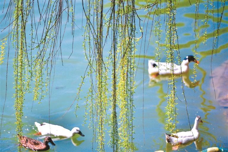 柳樹(shù)悄然吐新芽,鴨子在水中游弋。