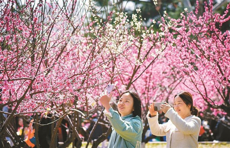 盛放的梅花吸引了許多游人前來(lái)打卡。