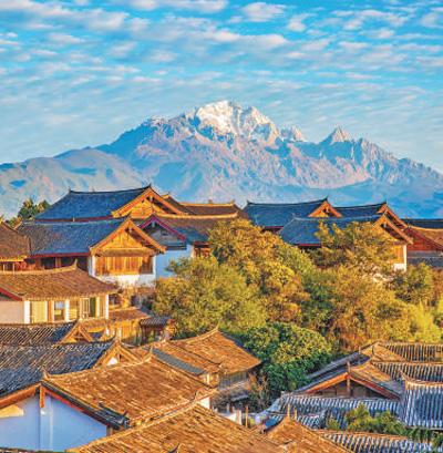 在玉龍雪山的一片銀白映襯下,麗江古城更顯寧靜。