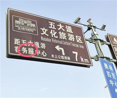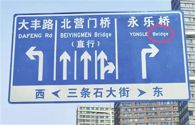 英文拼寫和翻譯的問題在天津市一些道路指示牌上也屢見不鮮。河?xùn)|區(qū)八緯路與北十五經(jīng)路交口,一塊地面立桿式道路指示牌上,“大直沽西路”的英文“west(西)”錯(cuò)誤標(biāo)為“east(東)”;紅橋區(qū)河北大街永樂橋橋下的指示牌,將“Bridge(橋)”錯(cuò)拼成“Beidge”;紅橋區(qū)西沽公園門口的一塊指示牌,將“丁字沽南大街輔路”英文翻譯成“Dingzigu South Auxlllary Rd”,誤拼的“Auxlllary”讓人難以理解。“我猜想,可能是要用‘Auxiliary(輔助的)’這個(gè)單詞。”河北工業(yè)大學(xué)的一位學(xué)生說(shuō)。