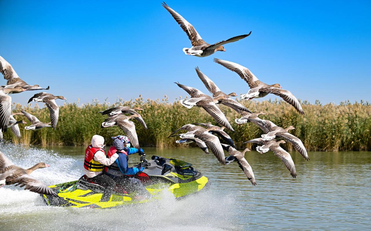 游客在沙湖景區(qū)乘坐快艇時(shí)大雁在一旁飛翔。當(dāng)日是國(guó)慶假期的第二天,許多游客來到寧夏石嘴山市沙湖景區(qū),感受沙漠與湖泊相依的獨(dú)特景觀。新華社記者 馮開華 攝