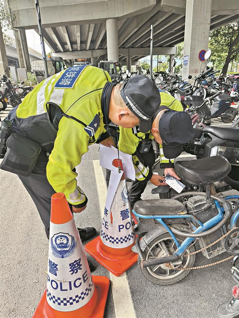 為進(jìn)一步優(yōu)化地鐵站口周邊交通秩序,交警部門在常態(tài)化路面攔查的基礎(chǔ)上,同步查處停放在道路上的涉及未懸掛廣州市有效號(hào)牌,號(hào)牌倒掛、側(cè)掛、破壞或者故意污損、遮擋等交通違法行為的電動(dòng)自行車,通過張貼宣傳告示、依法取證查處的方式分階段開展整治。