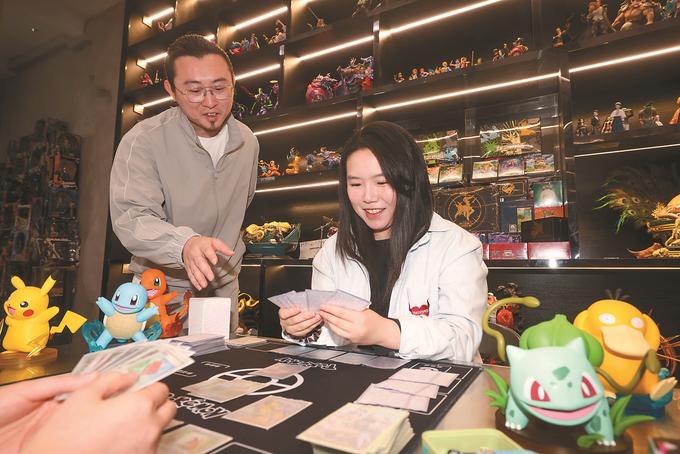 6月11日,南京市西城夜未央一家潮玩店,店主在指導(dǎo)客人玩卡牌游戲。小店定期組織卡牌對戰(zhàn)活動,將興趣與消費(fèi)深度融合,吸引不少消費(fèi)者光顧。記者 陳儼 攝