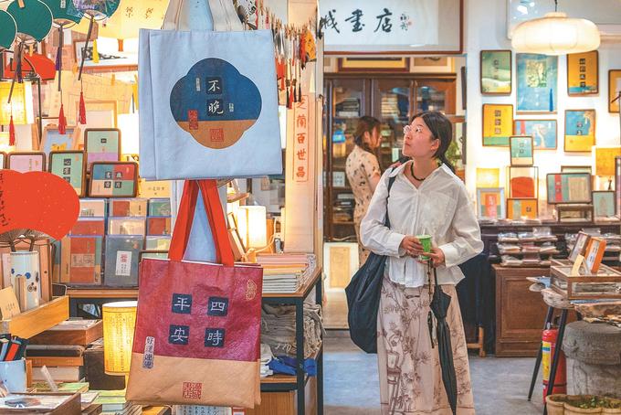 揚(yáng)州皮市街的邊城書店,能買書還能體驗古籍修復(fù),古籍拼貼畫、錦灰堆等文創(chuàng)產(chǎn)品更是吸引不少年輕人到此親近傳統(tǒng)文化。劉江瑞 攝 (視覺江蘇網(wǎng)供圖)