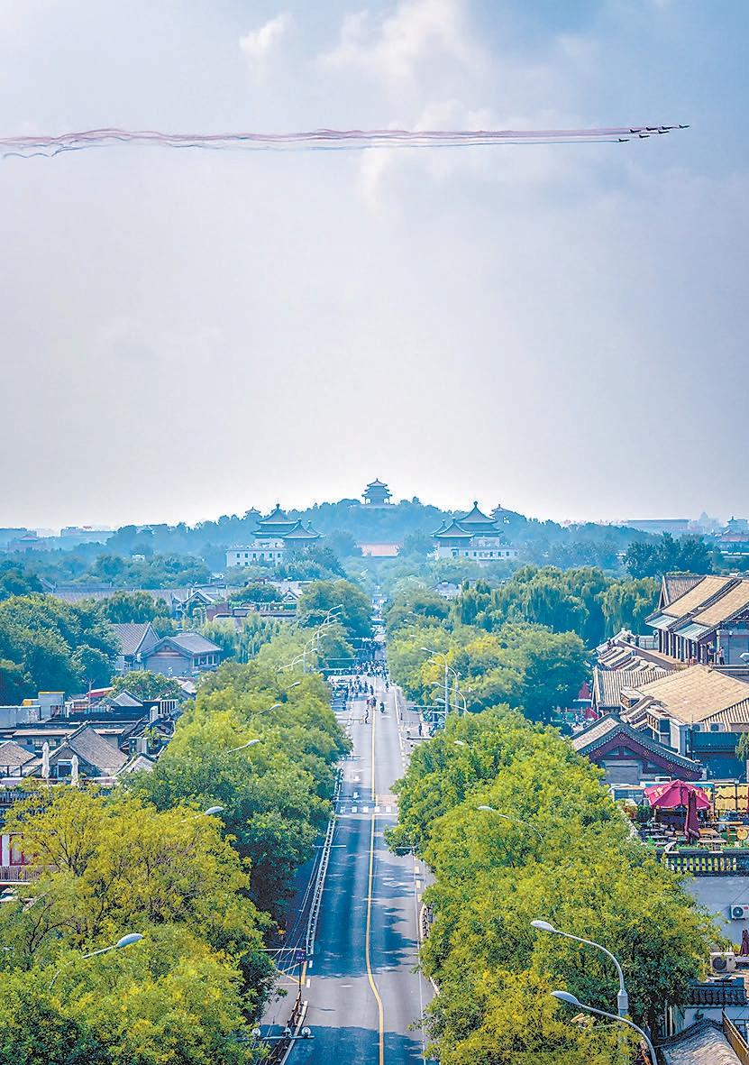戰(zhàn)機(jī)編隊拉出的彩煙與中軸線上的古都風(fēng)貌交相輝映。趙瑞 攝