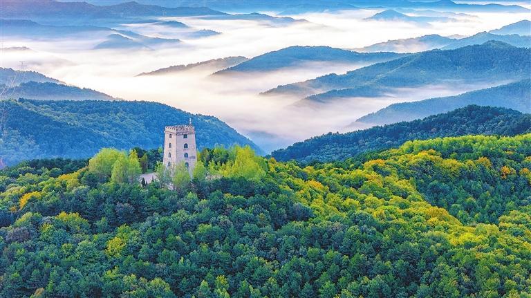 金秋時(shí)節(jié),晨曦中的正寧縣中灣林場(chǎng)調(diào)令關(guān)森林公園美如畫(huà)卷。王啟寧 攝