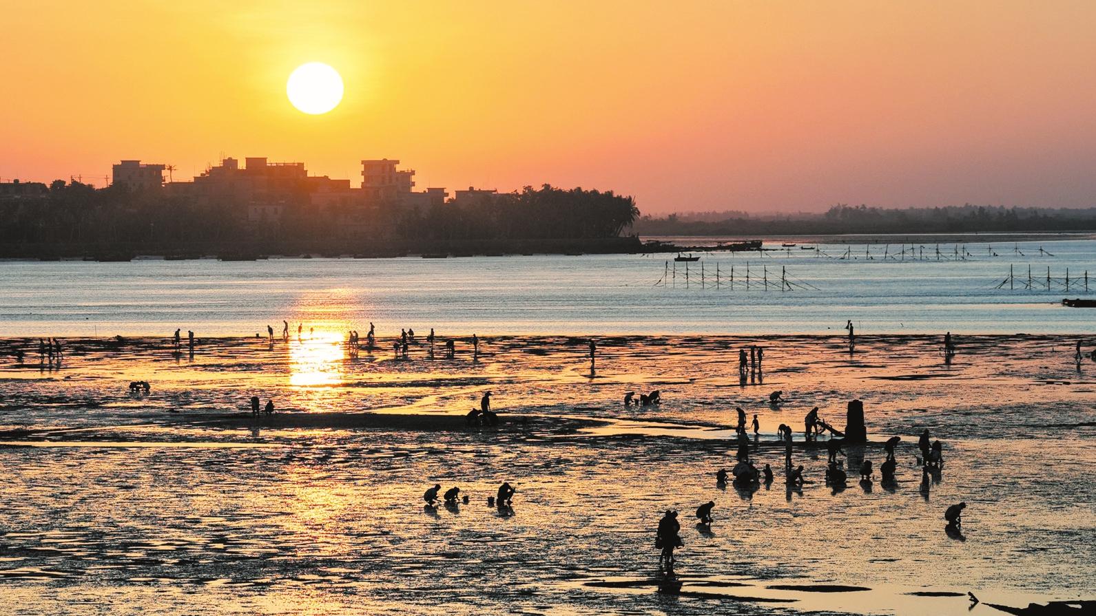 近日,在??谑忻捞m區(qū)演豐鎮(zhèn)北港島,朝陽(yáng)將灘涂染成金色。一大早,不少市民游客手提小桶、腳踩灘涂、彎腰拾貝,勾勒出一幅生動(dòng)的趕海畫卷。