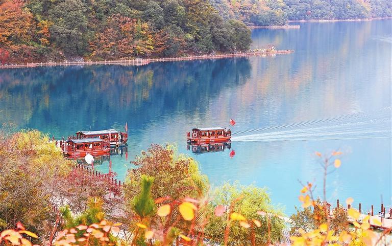 初冬時(shí)節(jié),甘肅省隴南市文縣天池國家森林公園層林盡染、碧波如鏡,吸引游客前來賞景游玩。通訊員 后斌玉