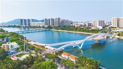 航拍陵水知音橋。該橋橫跨陵水河,有著獨特的雙層結構與鮮明的外觀,是一座智慧互動型人行景觀橋。記者 王程龍 攝