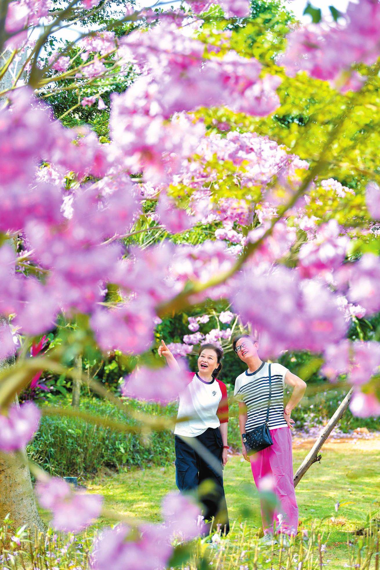 近年來,??谕ㄟ^栽植各類開花喬木,用繽紛花景勾勒城市美學(xué)輪廓,催生了多個(gè)網(wǎng)紅景觀。沿著國興大道前行,一條綿延的花帶在大道兩側(cè)延伸開來。微風(fēng)吹過,花瓣輕輕飄落,散落在茵茵綠草之上,猶如繁星點(diǎn)點(diǎn),別有情趣,意境動(dòng)人。“原本普通的綠化帶,因?yàn)闈M樹繁花一下子‘活’了起來,顏色豐富了,整個(gè)城市感覺更美了?!笔忻駝⒛扰e著手機(jī),興致勃勃地記錄著眼前美景。