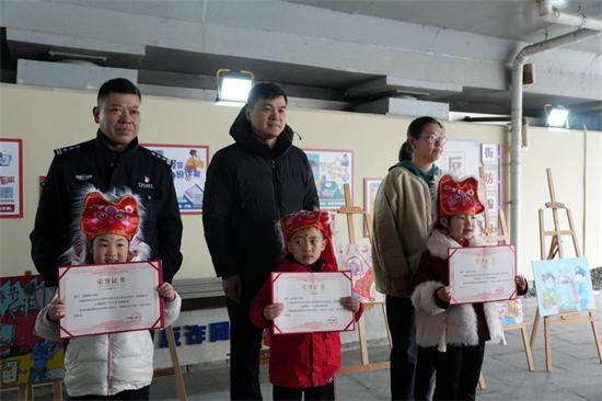 “這幅畫講的是不能隨意點(diǎn)擊陌生紅包鏈接,不然很容易被騙走錢?!毙∽髡呦虼蠹医榻B。小朋友們在活動(dòng)上舉辦的反詐童“畫”展,用稚嫩畫筆展示了孩童視角對防詐的理解。