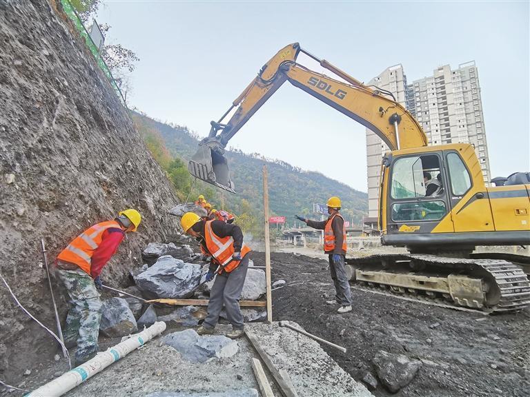 1月12日,在白河縣城區(qū)向榮—獅子山道路建設(shè)項(xiàng)目現(xiàn)場,工人在進(jìn)行路段肩墻砌筑工程施工。通訊員 鄒益山攝