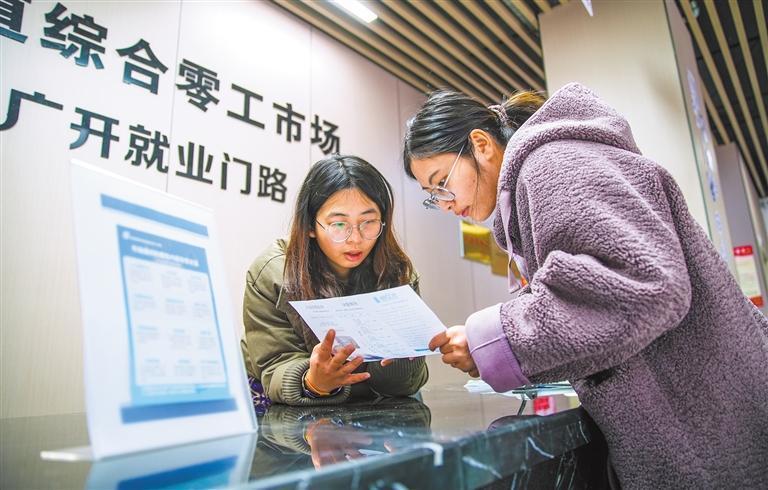 2月27日,浙江省湖州市德清縣阜溪街道綜合零工市場大廳,工作人員向求職者介紹靈活就業(yè)相關(guān)信息。王樹成攝(中經(jīng)視覺)