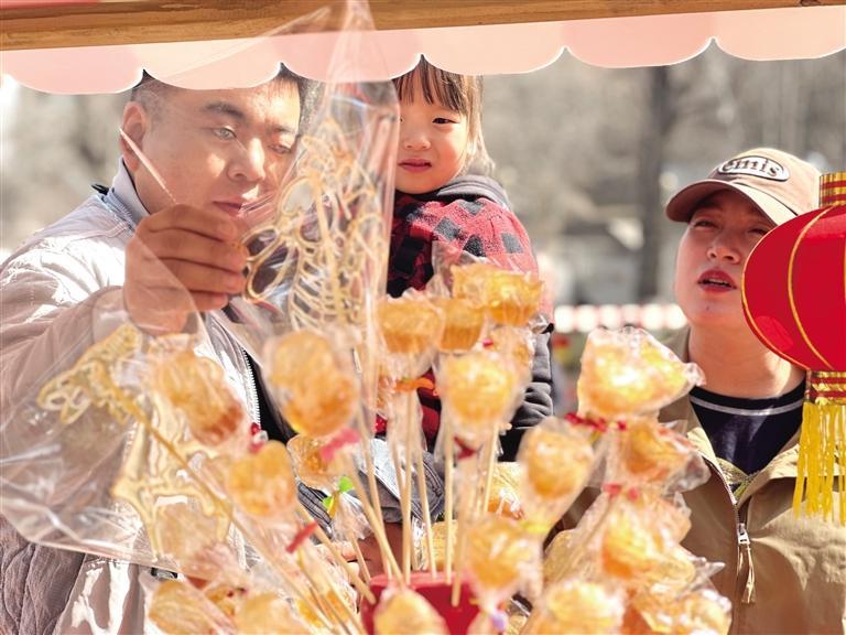市民在五泉山公園游玩時挑選畫糖。 張婧 攝