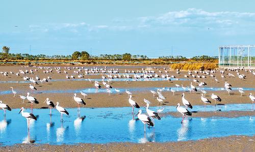 2025年11月4日,曹妃甸濕地和鳥類省級(jí)自然保護(hù)區(qū),成群的東方白鸛在覓食。河北日?qǐng)?bào)記者 趙 杰攝