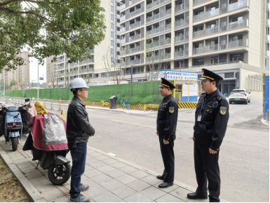 圖為執(zhí)法人員與工地項目經(jīng)理溝通工地外圍非機(jī)動車停放問題