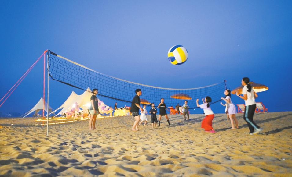 家長帶著孩子們?cè)诤?跇s山寮村的沙灘上打排球。記者 石中華 攝