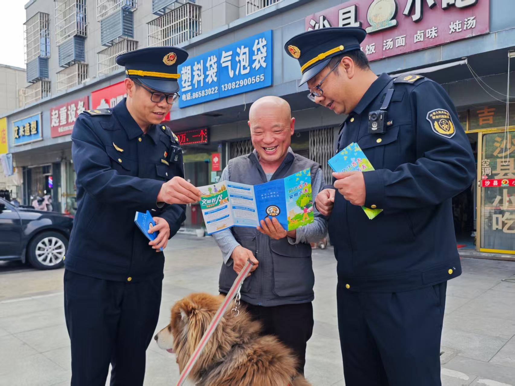 圖為執(zhí)法人員現(xiàn)場向市民宣傳《寧波市養(yǎng)犬管理?xiàng)l例》