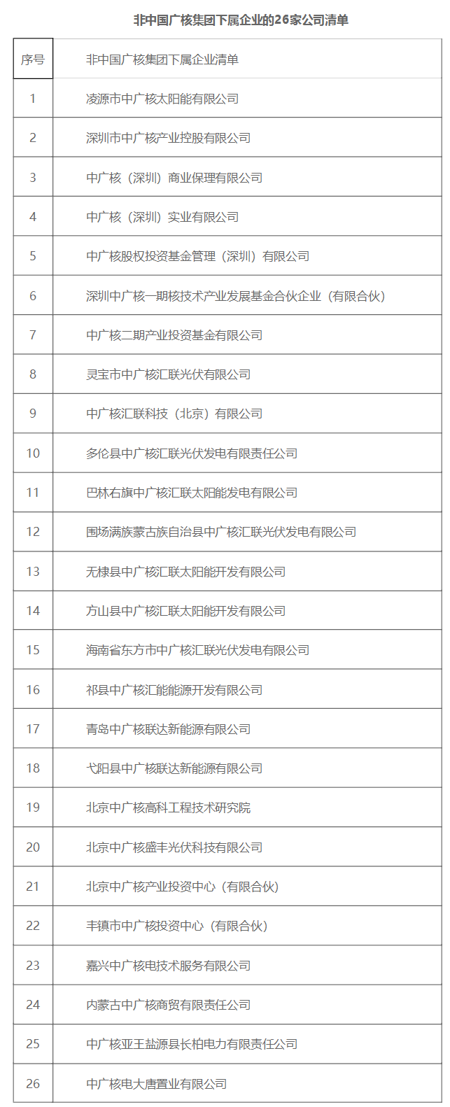 4月份,中廣核發(fā)布公告稱:凌源市中廣核太陽能有限公司、深圳市中廣核產業(yè)控股有限公司、嘉興中廣核電技術服務有限公司等26家公司在企業(yè)名稱中使用“中廣核”字樣。鑒于該26家公司并非我集團下屬企業(yè),鄭重澄清并嚴正聲明,中國廣核集團未擁有下述26家公司的任何資產或股權,亦無隸屬或管理關系,并未授權下述公司使用“中廣核”商標和字號,若因下述公司的經(jīng)營行為導致法律、勞務糾紛或其他相關責任,均與我集團無關。
