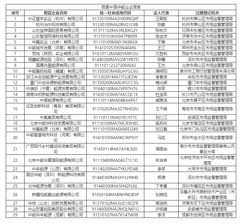 中國華能稱,發(fā)現(xiàn)不法分子通過偽造中國華能集團有限公司(以下簡稱“中國華能”)所屬企業(yè)證照和印章,在北京、深圳、杭州、鄭州、西安等地工商系統(tǒng)中將29家企業(yè)的股東分別登記為華能(大連)能源熱力有限責任公司、華能綜合產業(yè)有限公司、華能海外企業(yè)管理有限公司、華能新能源股份有限公司以及天津華能楊柳青熱電實業(yè)有限公司。
