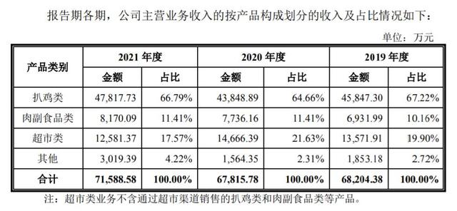 德州扒雞六成以上收入由扒雞貢獻。數據顯示,2019年至2021年,其扒雞類產品分別收入4.58億元、4.38億元、4.78億元,分別占主營業(yè)務收入的67.22%、64.66%、66.79%。