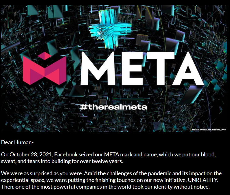 同時,小Meta的CEO還發(fā)表博客文章控訴道:“2021年10月28日,F(xiàn)acebook獲得了我們的META標(biāo)志和名稱,這是我們十二年來用自己的血、汗和眼淚建立起來的。我們和你們一樣驚訝……世界上最強大的公司之一在未告知的情況下奪走了我們的身份?!?/p>